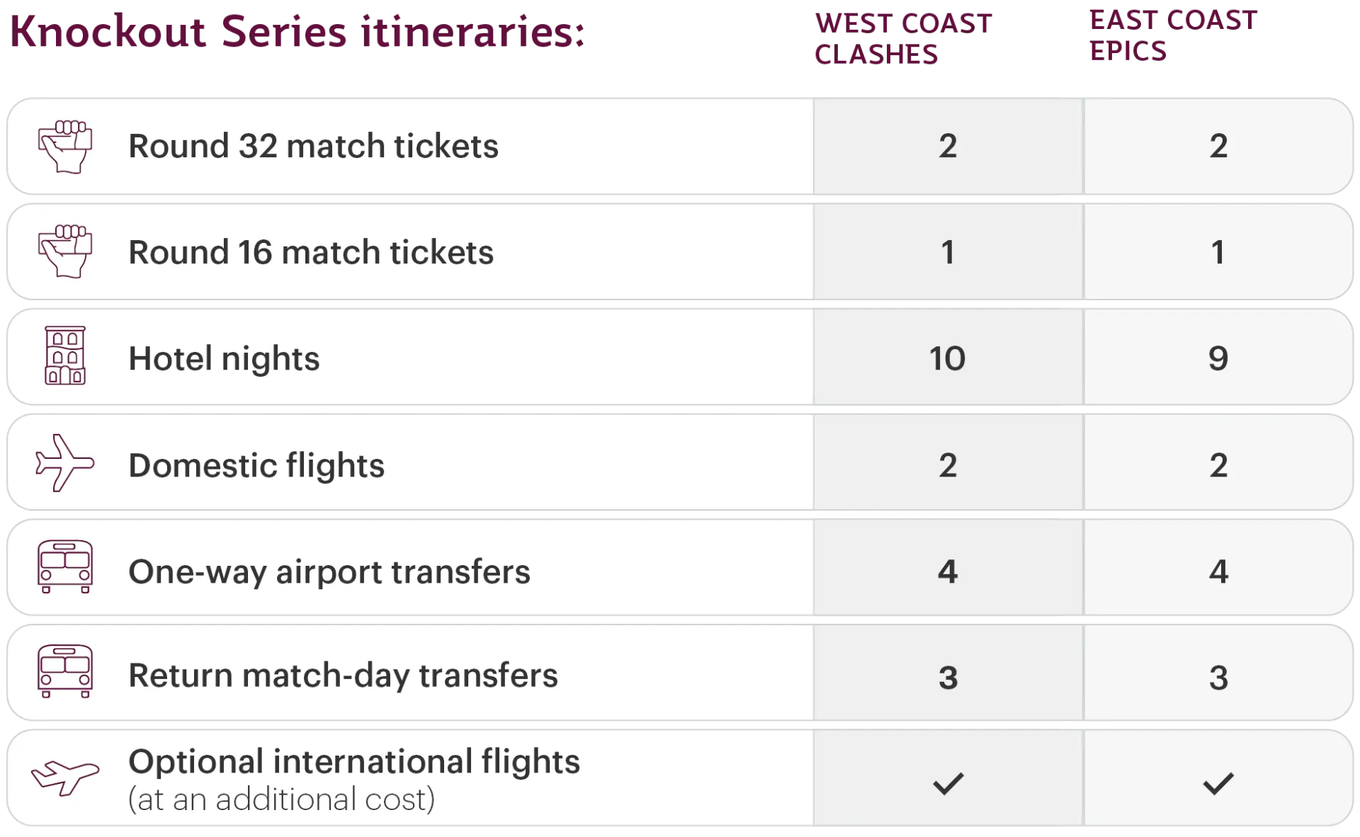 Reliable ground transfers provided between airports, hotels, and stadiums, conveniently arranged per your selected package.